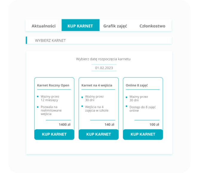 W systemie stworzysz karnety wejściowe (np. z 4 wejściami na miesiąc), ale także karnety długoterminowe na całe kursy na 10 miesięcy jak rok szkolny, płatne kartą kredytową. Możesz też powiązać karnet z typami zajęć np. gdy na droższe zajęcia trzeba wykupić dodatkowy karnet. To świetne rozwiązanie, które ułatwi Ci planowanie oferty!